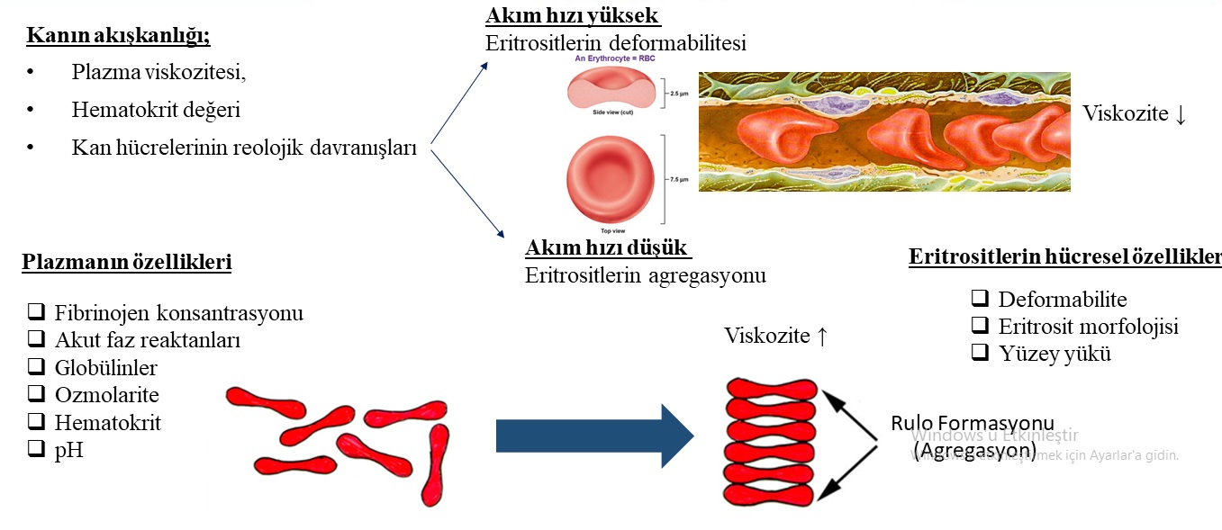 Kan dokusunun damar sistemi içindeki hareketi her şeyden önce kendi özelliklerine ve akışkanlığına bağlıdır. Kanın akışkanlığı, tüm çok fazlı sıvılarda olduğu gibi her bir fazın reolojik özellikleri ve iki fazın birbirine oranı ile belirlenir. Bu iki fazı, kanın hücresel elemanları ve plazma oluşturur. Buna göre, kanın akışkanlığı; plazma viskozitesi, hematokrit değeri ve kan hücrelerinin reolojik davranışlarından etkilenir. Viskozite, bir akışkanın (kan) belirli bir sıcaklıktaki akışa (kan akımı) karşı direncinin (kayma gerilimi) ölçüsüdür. Eritrositlerin şekil değiştirme yetenekleri (deformabilite) ve tersinir kümelenme eğilimleri (agregasyon), değişik koşullarda kanın akışkanlığının belirlenmesinde önemli rollere sahiptirler. Akım hızının yüksek olduğu koşullarda eritrosit deformabilitesi kan viskozitesini belirleyen temel faktörler arasındadır. Akımın yavaşlaması halinde ise, hücrelere etki eden kuvvetler küçülür ve kümelenme eğilimi ön plana çıkar (agregasyon). Eritrosit agregatlarının oluşması, bu koşullarda viskoziteyi yükseltir.